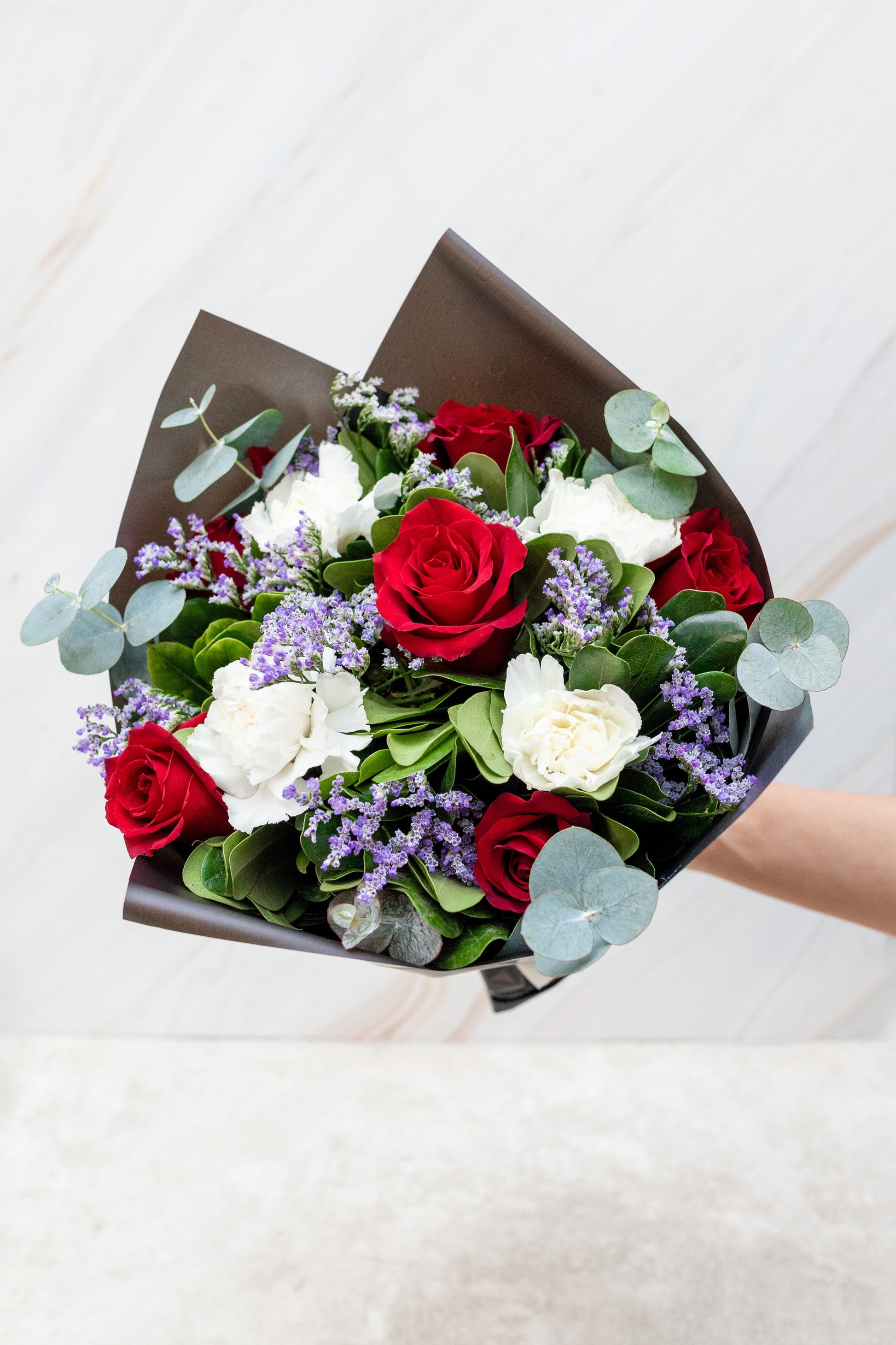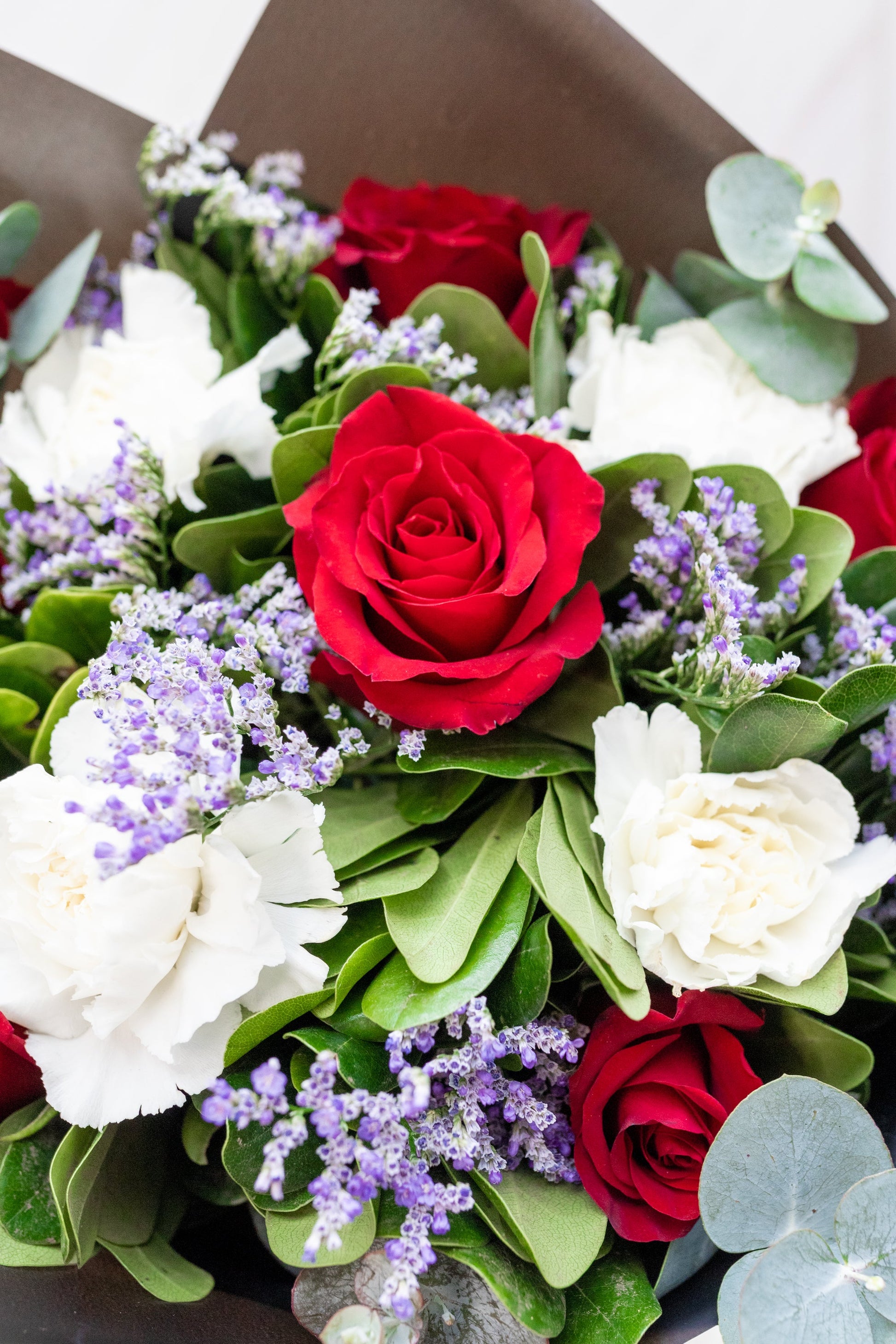 -Flores que contiene: Rosas Roja, Clavel Blanco, Limonium, Clavo Japonés, Dólar.