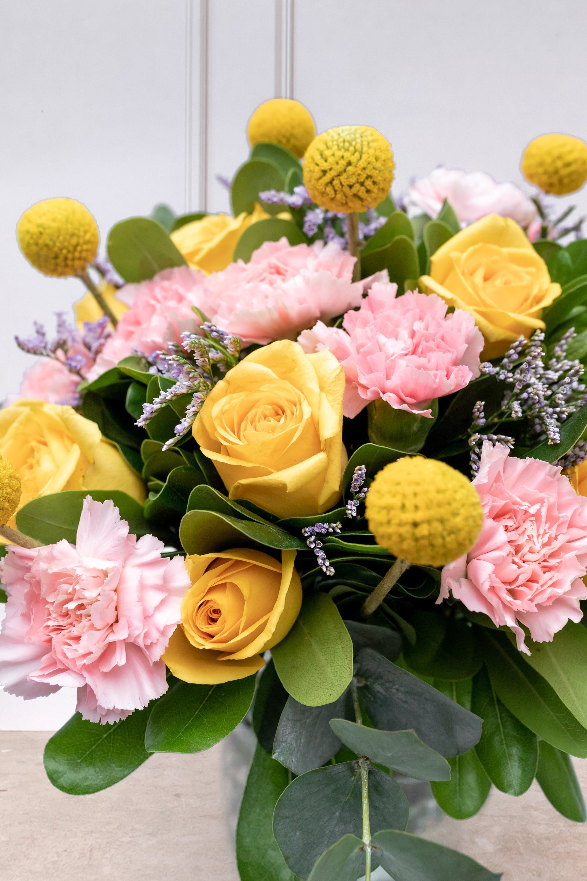 Este ramo Lolita está conformado por rosas amarillas, claveles rosas y craspedia, que representan amor, felicidad y prosperidad. Un regalo perfecto para expresar tus sentimientos a un ser querido. Con su delicada combinación de colores y flores, seguramente alegrará su día.