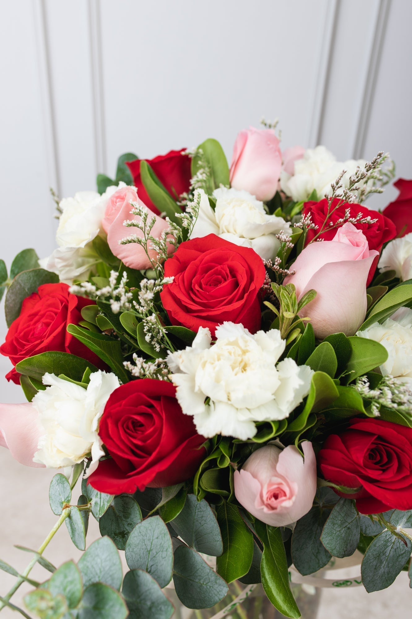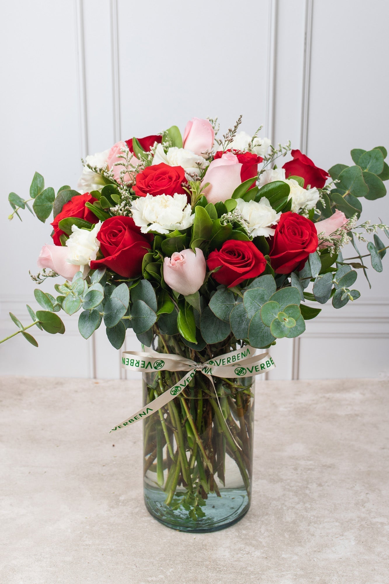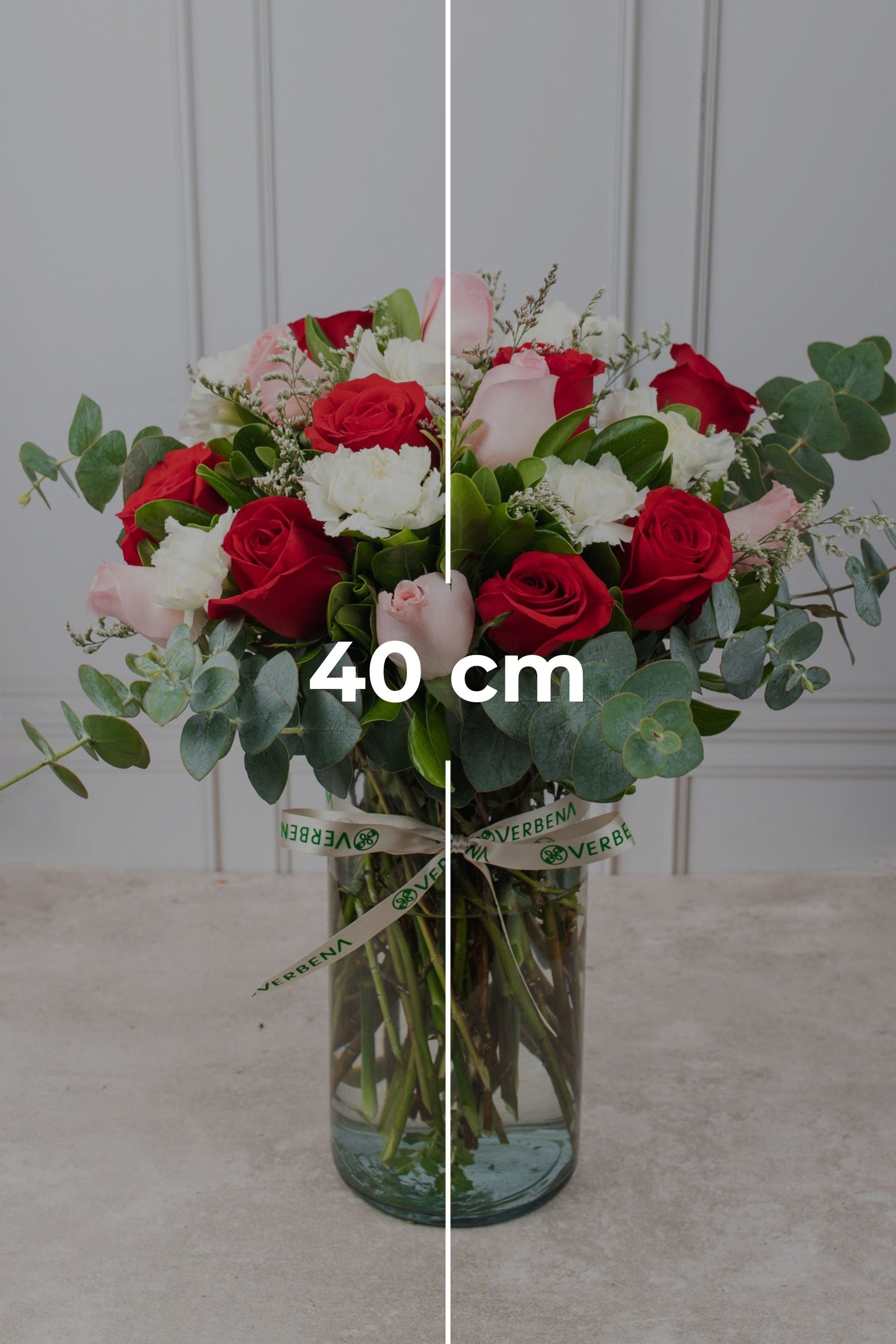 - Flores que contiene: Claveles Blancos, Rosas Rojas, Limonium, Clavo Japonés, Dólar.