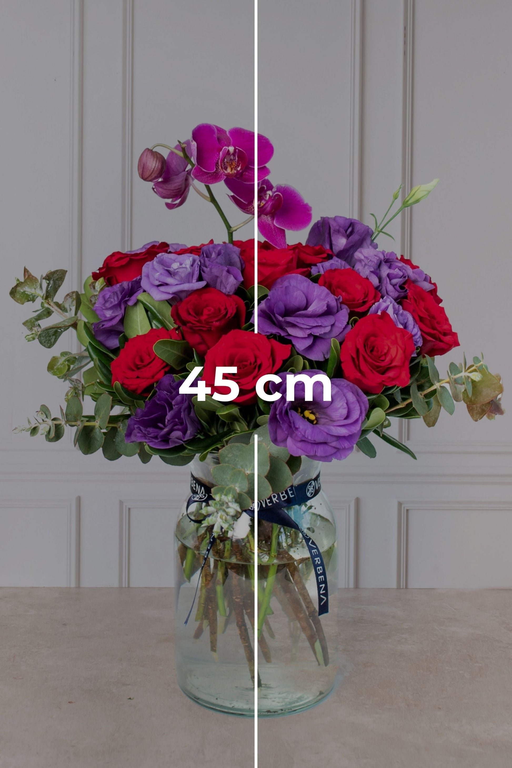 Flores que contiene: Rosa Roja, Lisianthus Morado y Orquídea Morada
